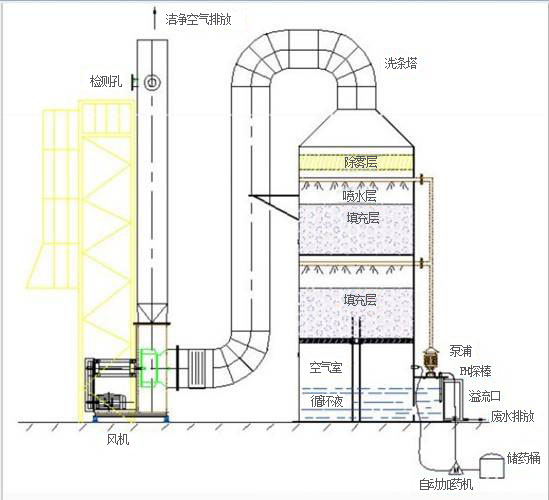 由于化学吸收液从塔顶往下喷淋,废气向上流,臭气与吸收液充分接触、反应而被去除。吸收液与废气流量比例(液/气比)一般为1-3 L/m 3 ,填料高度一般为2-5米,气体空塔流速一般为0.5-1米/秒。操作良