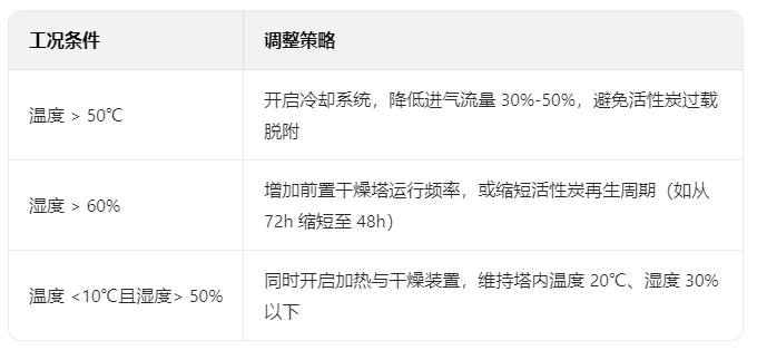 高湿度工况下,增加再生频次(如每周 2 次),防止活性炭长期吸水失效;