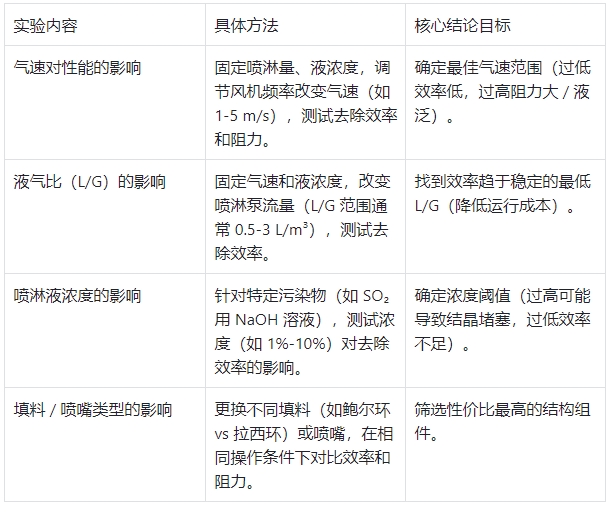 通过实验优化洗涤塔性能,需围绕净化效率、能耗、稳定性三大核心目标,结合单因素实验、多因素正交 / 响应面实验、动态运行测试等方法,系统探究关键参数对性能的影响规律,最终确定最优运行条件或结构设计。 通过实验优化洗涤塔性能,需围绕净化效率、能耗、稳定性三大核心目标,结合单因素实验、多因素正交 / 响应面实验、动态运行测试等方法,系统探究关键参数对性能的影响规律,最终确定最优运行条件或结构设计。以下是具体实验优化思路与步骤: 一、实验设计前的准备 明确优化目标与评价指标 核心指标:污染物去除效率(如 SO₂、粉尘、VOCs 的去除率)、压力损失(能耗)、液气比(L/G,影响运行成本)、长期运行稳定性(如阻力变化、喷嘴堵塞情况)。 辅助指标:喷淋液 pH 值变化、雾滴夹带量、废液污染物浓度(评估二次污染风险)。 确定关键影响因素 根据洗涤塔类型(如填料塔、空塔、板式塔)和处理对象,筛选需优化的参数,常见因素包括: 操作参数:进气流量(气速)、喷淋量(液气比 L/G)、喷淋液浓度 / 温度、进气污染物浓度。 结构参数:填料类型 / 高度、喷嘴类型(空心锥 / 扇形)/ 布置密度、塔径 / 塔高比、除雾器类型。